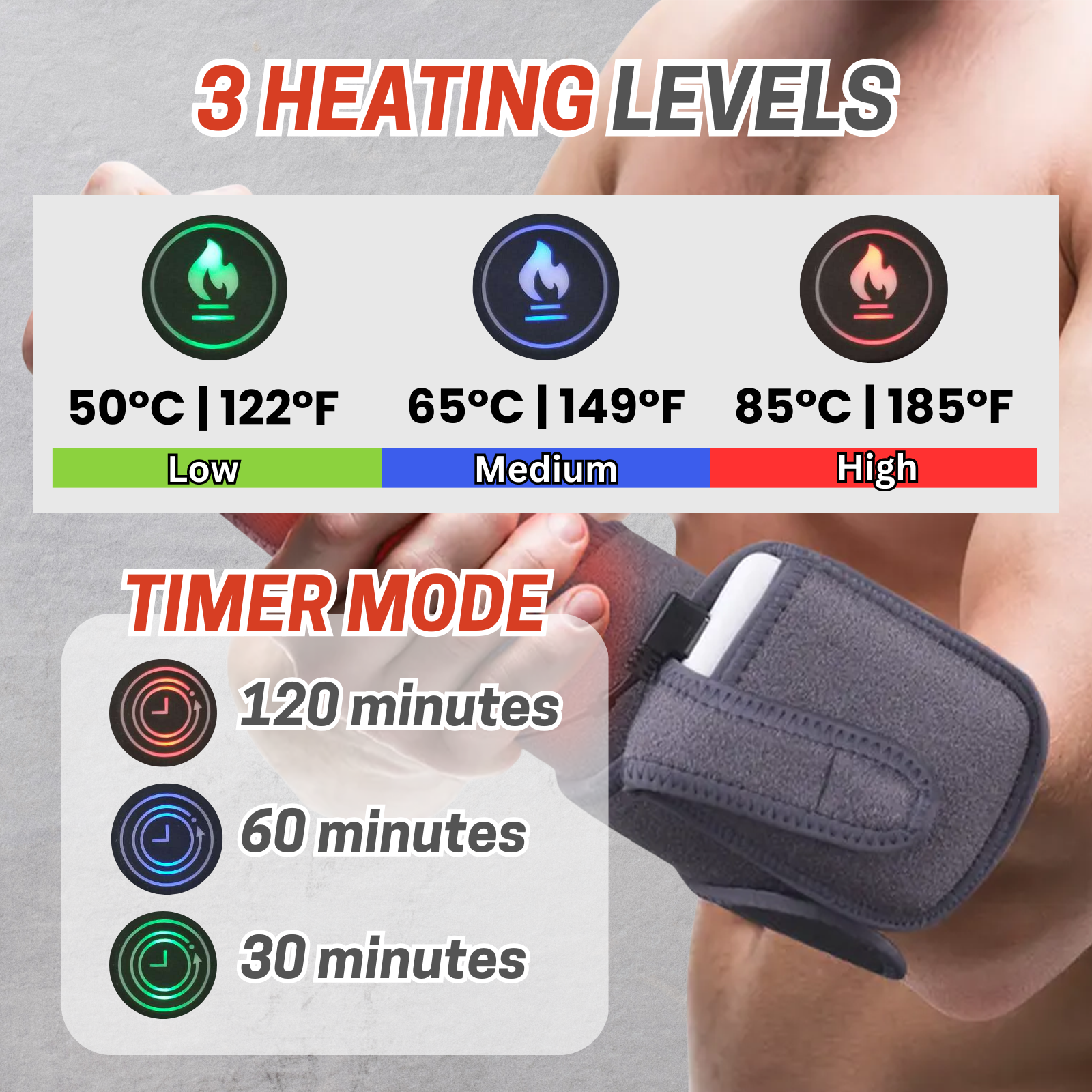 Multipurpose heated brace for wrist, arm, elbow, ankle, or knee with a 5000mAh rechargeable battery and 3 heat settings. Helps relieve pain, stiffness, and swelling by improving blood circulation and reducing fatigue.